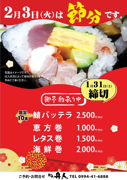 2月3日(火)は恵方巻の販売のみとさせていただき、お食事の営業はお休みいたします。 また、翌日の2月4日(水)も臨時休業とさせていただきます。よろしくお願いいたします。 |