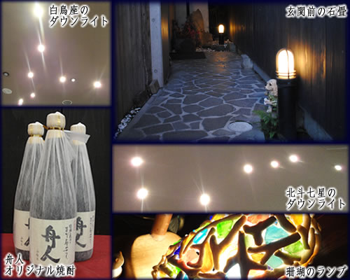 天井には、北斗七星と、白鳥座を模ったダウンライトがあったり、玄関のエントランスに珊瑚のランプがあったりと、幻想的で、お客様を楽しませたい、という心意気(こだわり)がいっぱいです。